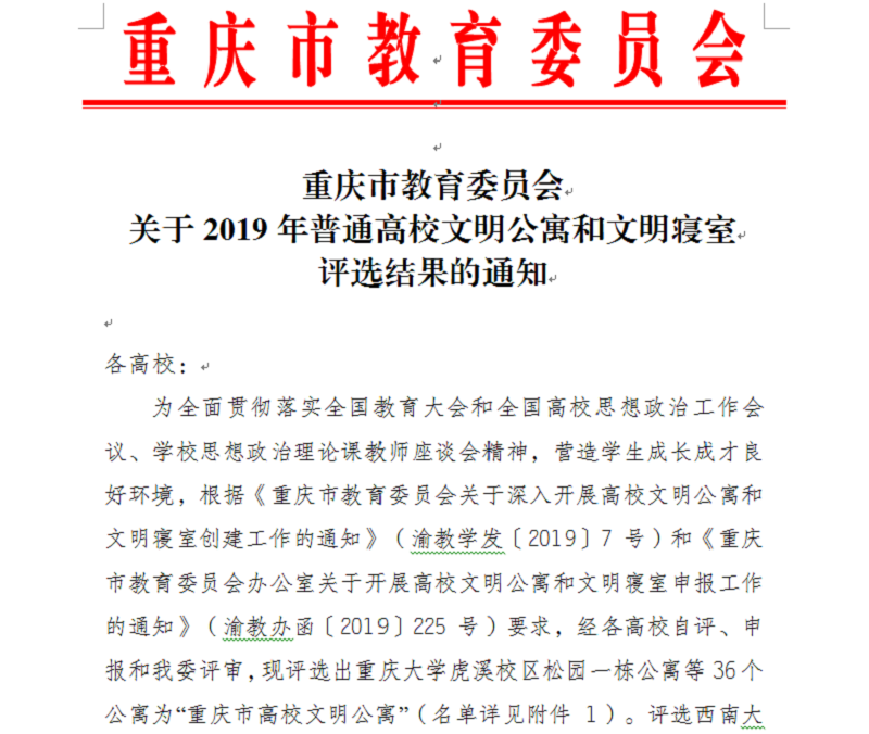 本网讯(文/图 学生处 黄炜)近日,重庆市教委发布了《关于2019年普通高校文明公寓和文明寝室评选结果的通知》,我校和园3号二单元416室等4个学生寝室荣获“特色寝室”称号,和园3号一单元414寝室等11个学生寝室荣获“文明寝室”称号。