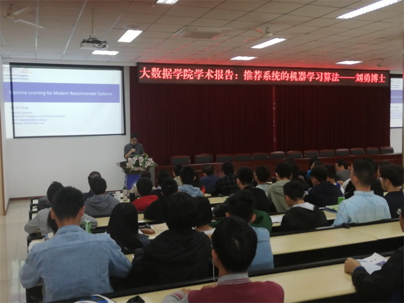 本网讯(文/图 大数据与人工智能学院 陈怡然)应大数据学院邀请,10月24日中午,新加坡南洋理工大学、阿里巴巴——南洋理工大学新加坡联合研究科学家刘勇博士莅临我校,在6教302报告厅举办了一场名为“推荐系统的机器学习算法”专题讲座。本次讲座由大数据学院专业教师陈怡然主持,学院副院长陈欣及相关部门领导出席,共有来自各个学院300余名师生参加。