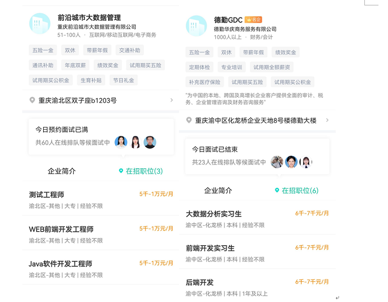 本次网络双选会共吸引腾讯、海康威视、中国电信、招商银行、中建集团、上海宝冶、北京现代、铃耀汽车、英业达、维塔士、成都四方伟业、涪陵榨菜集团、梅安森、苏州亚翔系统集成、西南集成电路、旭硕科技、惠科金渝、京东方、重庆通服、重庆信科、中显智能、唐卡装饰、金科、融创等554家企业参会,带来了18821个岗位,专业需求涵盖了学校大数据、计算机、软件、电子信息、数字艺术、建筑工程、经济管理等7个学科专业群、21个本科专业。截止到当天下午6:00,本次网络双选会吸引了校内外近5700余人次学生参加此次双选会,共投递3728简历,当日线上申请面试2342人次,已面试848人,初面通过700人。由于时间关系,部分企业仍在持续组织后续面试。
