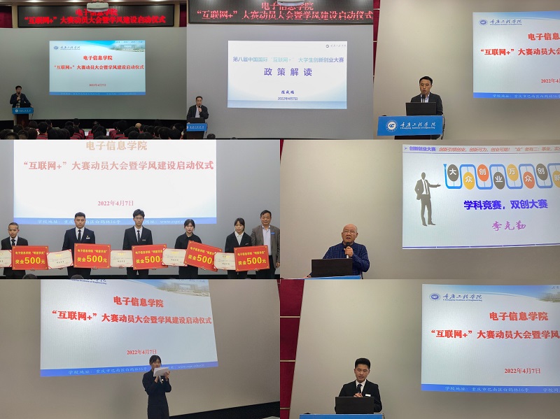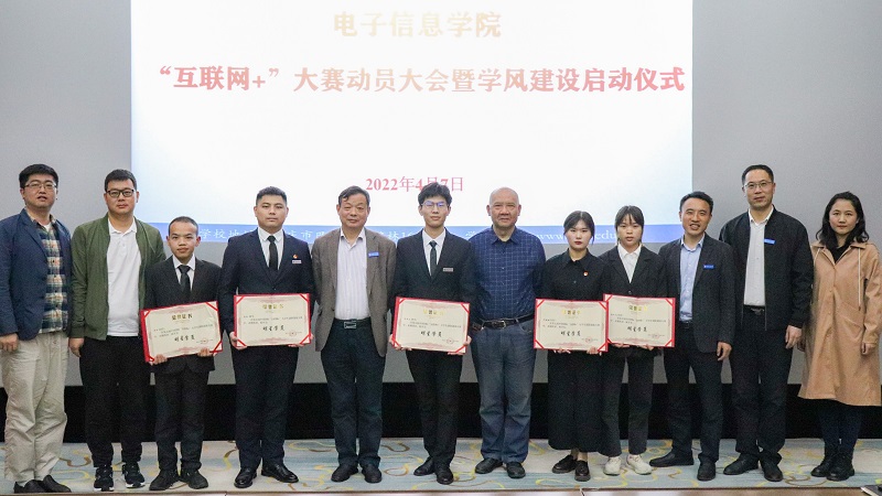 本网讯(文/图 电子信息学院 魏登雪)为进一步激发广大学生的创新热情、增强创新意识、培养创新能力,巩固“以赛促学、以赛促教、以赛促创”的成果,以优异的学科竞赛成绩和奋发向上的优良学风迎接本科教学合格评估。4月7日,电子信息学院在阶梯报告厅举行“互联网+”大赛动员大会暨学风建设启动仪式,院长何世彪及全体院领导出席会议,各系主任、老师代表、全体辅导员以及2019级、2020级各班级学生代表参加会议,党总支书记谭思宇主持会议。