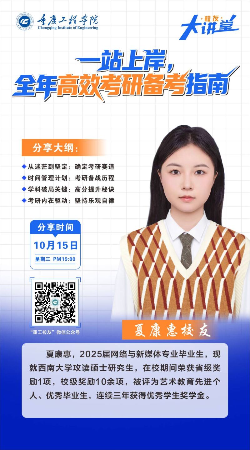 本网讯(文/图 就业指导中心 叶秋清)10月15日晚,由学校就业指导中心主办的“校友大讲堂”在线上举行。2023届网络与新媒体专业优秀校友、现西南大学新闻与传播专业研究生夏康惠应邀作“考研经验与成长之路”主题分享,近6000人次学生在线参与。
