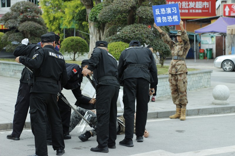 演练设定在学校大门,一名“持械暴徒”强闯校门,意图袭击师生。学校安保人员发现后立即启动“一键报警”系统,同时手持防暴盾牌、钢叉等器械与“暴徒”周旋,防止其进入校园。同时立即发出警报,组织附近师生有序疏散到安全区域,紧锁门窗,防止“暴恐分子”闯入教学楼及宿舍区域,随后各应急小组迅速到场,按照应急预案,运用专业战术配合,成功将“暴恐分子”制服抓获,并等待民警的到来。