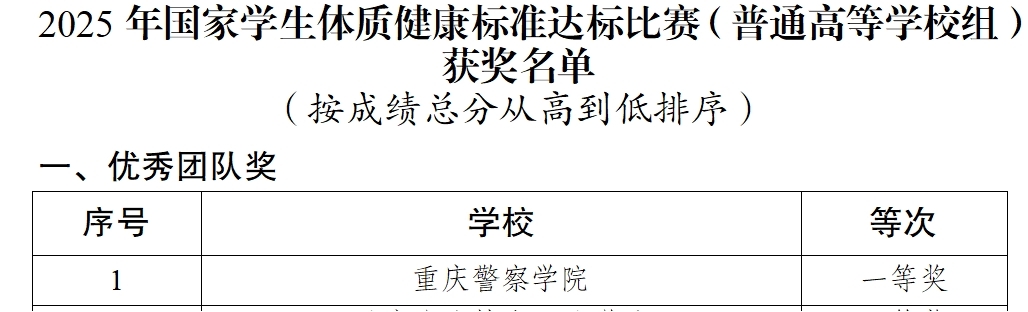 近日,由重庆市教育委员会主办、重庆第二师范学院承办的2025年国家学生体质健康标准达标比赛(普通高等学校组)获奖名单公布,我校凭借扎实的体质健康基础与出色的赛场表现,以总分2223.5分的优异成绩成功斩获团体一等奖,同时多名学生获评个人“良好”等次,实现团体与个人荣誉双丰收。